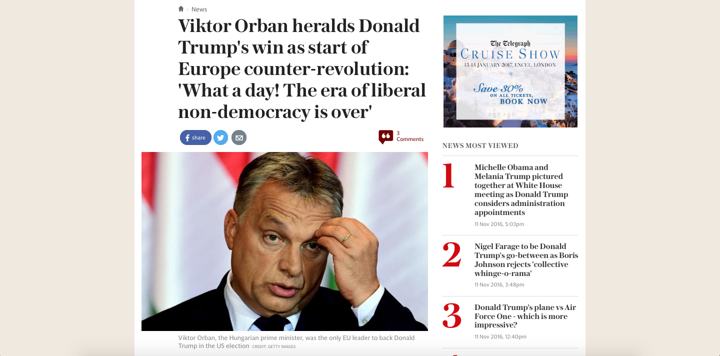 Interjút közöl Orbán Viktor miniszterelnökkel a The Daily Telegraph című konzervatív brit napilap. A lap európai szerkesztője, Peter Foster a magyar kormányfő minapi londoni látogatása idején készítette az interjút, amely szombatra virradóra jelent meg az újság online kiadásában. A magyar kormányfő beszélt Donald Trump amerikai elnökké választásának várható hatásairól a világpolitikára, Magyarország és az Európai Unió viszonyáról, és kifejtette véleményét a Brexitről is.