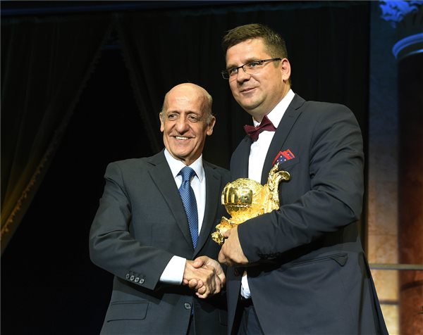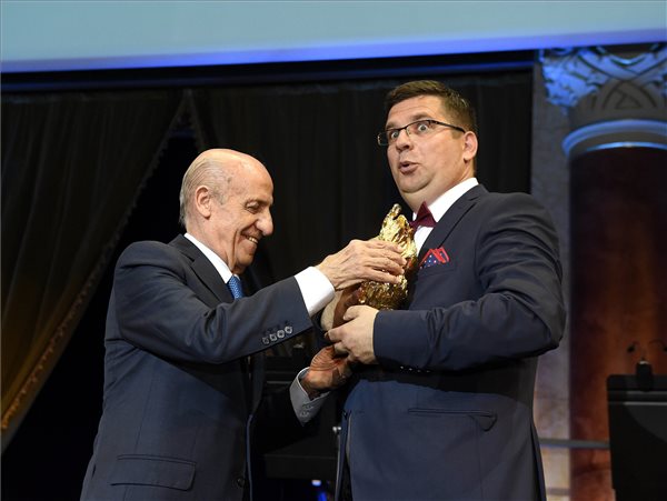 Julio Cesar Maglione, a Nemzetközi Úszó Szövetség (FINA) elnöke (b) átadja a szövetség díját Seszták Miklós nemzeti fejlesztési miniszternek, a KDNP alelnökének a budapesti, 17. vizes világbajnokság szervezőbizottsága elnökének a sportesemény alkalmából rendezett gálán a Pesti Vigadóban 2017. július 26-án. (MTI Fotó: Bruzák Noémi)