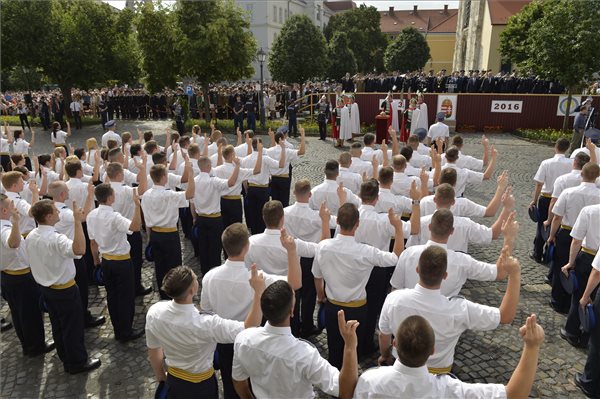A 219 végzett hallgató a Szent Korona másolata és a történelmi zászlók előtt, a kormányfő, Pintér Sándor belügyminiszter, Simicskó István honvédelmi miniszter, valamint a tábornoki kar jelenlétében tette le a tiszti esküt a Kapisztrán téren.