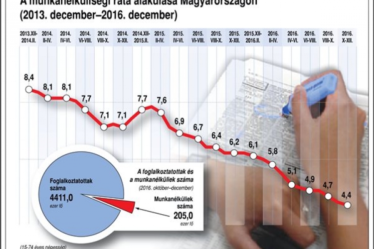 Varga Mihály elmondta azt is, hogy a munkanélküliségi ráta 4,4 százalékra csökkent a tavalyi utolsó negyedévben, a 2010-es 11,6 százalékról. A rendszerváltozás óta Magyarországon soha nem volt ilyen alacsony a munkanélküliség – mutatott rá. Uniós összehasonlításban csak Csehország (3,6 százalék) és Németország (3,9 százalék) előzi meg Magyarországot, míg az uniós átlagos munkanélküliségi ráta 8,3 százalék – ismertette. A kormány a foglalkoztatás további bővülésével számol a következő hónapokban, amelyet alátámaszt a fogyasztás növekedése, így a szolgáltató szektorban foglalkoztatottak számának bővülése, a vállalatok korábban bejelentett kapacitásbővítései, a lakásépítések számának várható megugrása, valamint az uniós források felhasználásának gyorsítása is kedvező hatással lehet a foglalkoztatásra – fejtette ki.