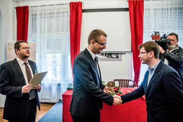 Rétvári Bence, az Emberi Erőforrások Minisztériuma (EMMI) kereszténydemokrta parlamenti államtitkára átadja a Gérecz Attila-díjat Korpa Tamás költőnek az 1956-os forradalom és szabadságharc 60. évfordulóján rendezett megemlékezésen a Magyar Írószövetség fővárosi székházában 2016. október 23-án. (MTI Fotó: Balogh Zoltán)
