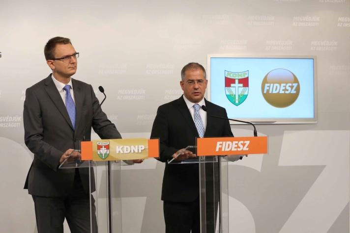 Rétvári Bence, a Kereszténydemokrata Néppárt (KDNP) alelnöke, az Emberi Erőforrások Minisztériumának parlamenti államtitkára és Kósa Lajos, a Fidesz frakcióvezetője közös sajtótájékoztatót tartott a vasárnapi kvótareferendum tétjéről Budapesten. (Fotó: fidesz.hu)