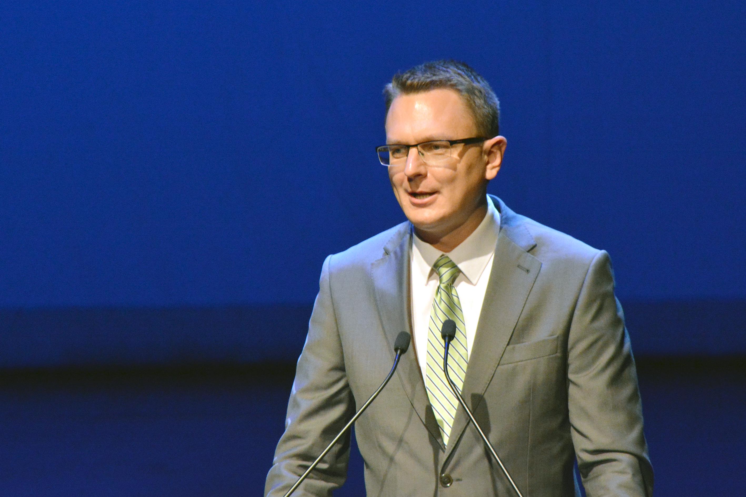 Rétvári Bence, az Emberi Erőforrások Minisztériumának parlamenti államtitkára, a KDNP alelnöke beszél a Katolikus Pedagógiai Intézet fennállásának 20. évfordulója alkalmából rendezett gálaműsoron (Fotó: Váli Miklós)