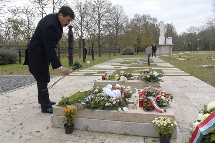Fotó: Áder János köztársasági elnök virágot tesz Nagy Imre miniszterelnök sírjára a Rákoskeresztúri új köztemető 301-es parcellájában az 1956-os forradalom és szabadságharc leverésének és a szovjet csapatok bevonulásának 60. évfordulóján, a nemzeti gyásznapon 2016. november 4-én. MTI Fotó: Kovács Tamás