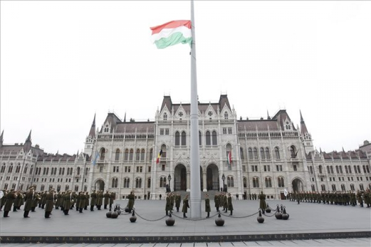 Katonai tiszteletadás mellett felvonták, majd félárbócra engedték Magyarország nemzeti lobogóját az 1956-os forradalom és szabadságharc leverésének és a szovjet csapatok bevonulásának 60. évfordulóján, péntek reggel Budapesten, a Parlament előtti Kossuth Lajos téren. A kegyelet kifejezéseként a lobogó egész nap félárbócon marad a nemzeti gyásznapon.