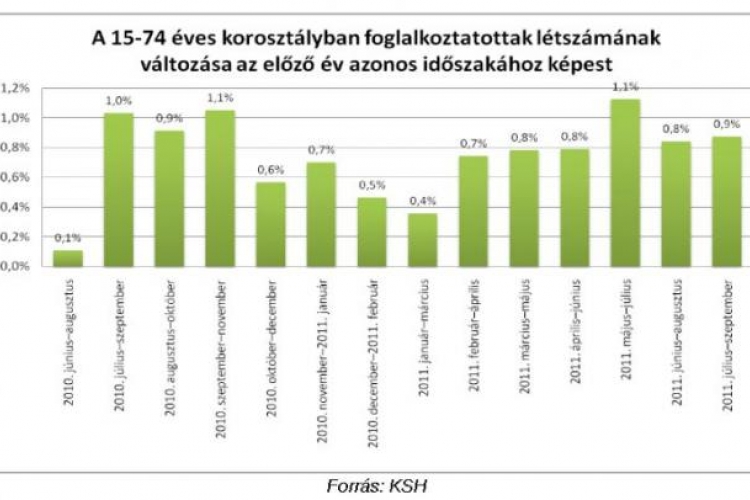 A Központi Statisztikai Hivatal (KSH) ma közzétett adatai szerint egyre nő Magyarországon a foglalkoztatás, a harmadik negyedévben 33 ezerrel (0,87 százalékkal) többen dolgoztak, mint az előző év azonos időszakában, így a foglalkoztatottak száma 3 millió 856 ezer volt.