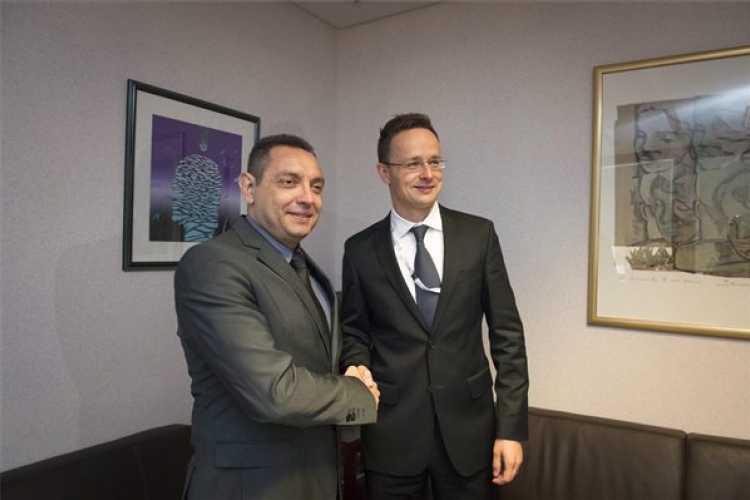 Szijjártó Péter külgazdasági és külügyminiszter kezet fog Aleksandar Vulin szerb szociális ügyi miniszterrel, aki többek között migrációért is felelős miniszter, tárgyalásukon a kétnapos EU-Afganisztán konferencia második napján Brüsszelben 2016. október 5-én. A tanácskozáson az uniós tagországok külügyminiszterei és mintegy 70 ország képviselői vesznek részt. (MTI Fotó: KKM/Burger Zsolt)