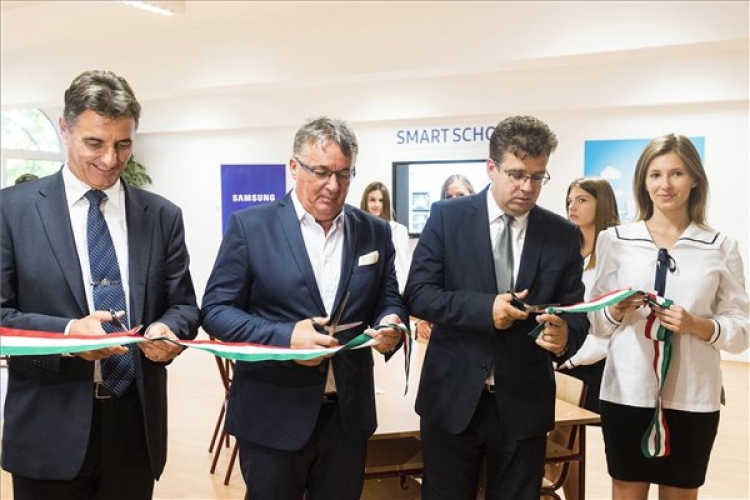 Seszták Miklós kereszténydemokrata nemzeti fejlesztési miniszter (j2), Leleszi Tibor (KDNP) polgármester (b2) és Facskó István, a Samsung Electronics Europe regionális vezetője átvágja a nemzetiszínű szalagot az interaktív digitális okostantermek átadásán a kisvárdai Bessenyei György Gimnáziumban 2016. szeptember 9-én. A felső-szabolcsi városban a Samsung által indított program révén összesen három tanulást és a tanítást segítő okostanteremet alakítottak ki. A kisvárdaival együtt már húsz digitális okostanterem működik az országban. (MTI Fotó: Balázs Attila)