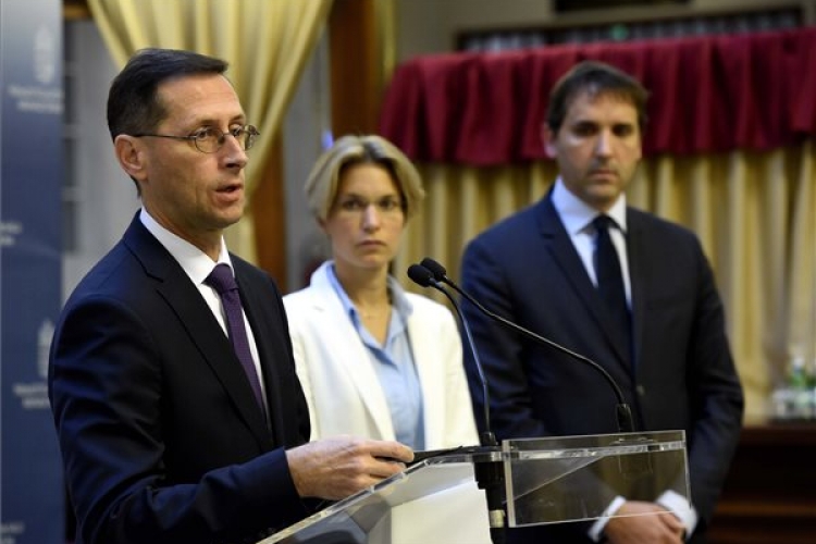 Varga Mihály nemzetgazdasági miniszter a Magyarország devizakötvény-cseréjéről tartott sajtótájékoztatón a Nemzetgazdasági Minisztériumban 2017. október 5-én. Jobbra Hornung Ágnes pénzügyekért felelős államtitkár (j2) és Barcza György, az Államadósság Kezelő Központ Zrt. vezérigazgatója (j). (MTI Fotó: Bruzák Noémi)