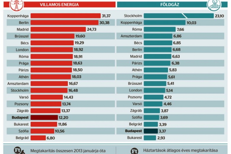 Ma Magyarországon a második legalacsonyabb a gáz és a harmadik legalacsonyabb a villamos energia ára az Európai Unióban. A Magyar Energetikai és Közmű-szabályozási Hivatal legfrissebb, 2016 decemberére vonatkozó adataiból kiderül, hogy az európai fővárosokat összevetve Budapesten a második legalacsonyabb a földgáz és a negyedik legkisebb az elektromos áram ára. A kilowattóránként számolt, az összevethetőség kedvéért eurócentben kifejezett gázár a magyar fővárosban 3,37 volt (valamivel több mint 104 forint), ennél kevesebbet csak Bukarestben kell fizetni az energiahordozóért: 2,93 centet. Összehasonlításként Zágrábban 3,87, Varsóban 4,46, Pozsonyban pedig 4,72 eurócentbe kerül egy kilowattóra, a nyugat-európai fővárosokban ennél jóval többet, akár a magyarországi többszörösét kell fizetni.