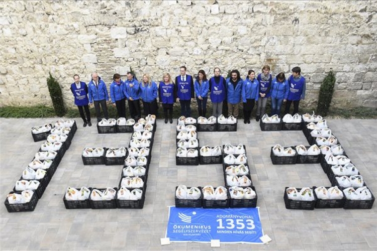 A 1353-as adományvonal óriásméretű számai, amelyeket tadományokból raktak ki az Ökumenikus Segélyszervezet Ételt, otthont és esélyt a rászorulóknak! elnevezésű országos adventi pénzadománygyűjtésének indítása alkalmából tartott sajtótájékoztatón 2016. november 27-én. A háttérben Rácsok Balázs, az Ökumenikus Segélyszervezet szociális és fejlesztési igazgatója, Lehel László, a segélyszervezet elnök-igazgatója, Lévai Anikó, és, Kovács Koko István jószolgálati nagykövetek, Károlyi Zsuzsanna, az E. ON Hungária Zrt. kommunikációs vezetője, Csákvári Andrea, a segélyszervezet gazdasági igazgatója, Gáncs Kristóf kommunikációs vezető, Horváth Brigitta munkatárs, Lakatos György hegedűművész, Czapp József református lelkész, önkéntes, Rátonyi Krisztina műsorvezető, Keveházi Klára humanitárius és fejlesztési igazgató, Révfalvi Dorottya, az országos segélyközpont vezetője és Detre László munkatárs (b-j). A 1353-as telefonszámon hívásonként 250 forinttal lehet támogatni a szervezet munkáját. (MTI Fotó: Kovács Tamás)