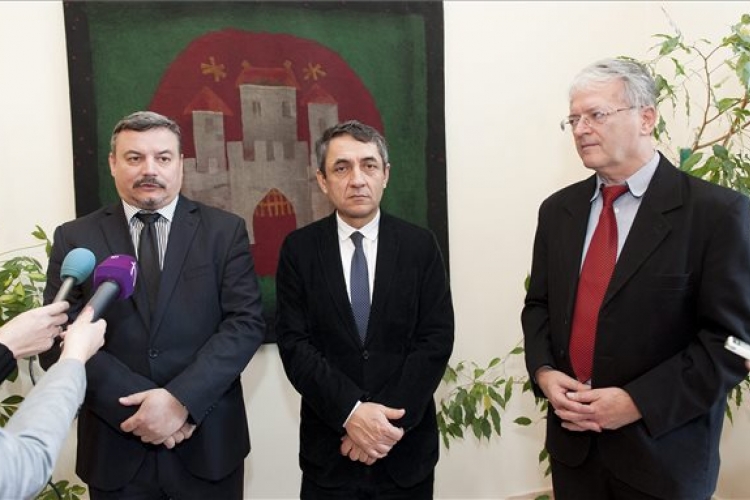 Berényi József, a Magyar Közösség Pártjának (MKP) elnöke és Potápi Árpád János, a Miniszterelnökség nemzetpolitikáért felelős államtitkára a megbeszélésük után tartott sajtótájékoztatón a révkomáromi városi hivatalban 2016. január 19-én. Jobbra Stubendek László, Révkomárom polgármestere. (MTI/Fotó: Krizsán Csaba)