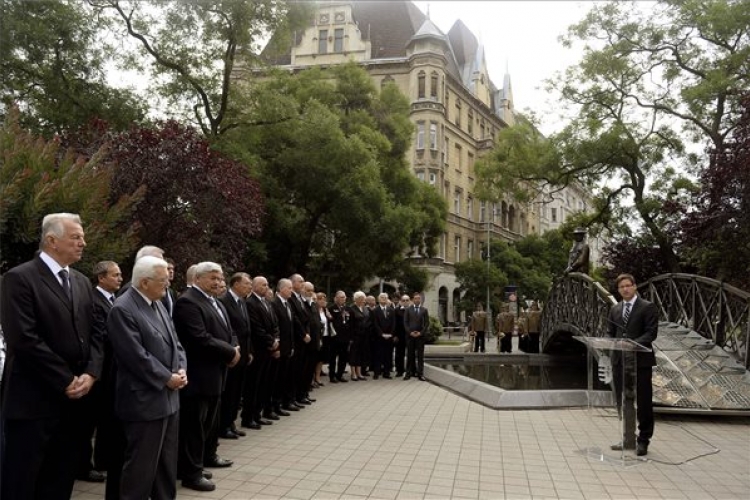 A fővárosi Vértanúk terén tartott megemlékezésen egy szál fehér rózsával és néma főhajtással rótta le tiszteletét mások mellett Benkő Tibor vezérkari főnök, Szegő László, a köztársasági elnök főhadsegédje, országgyűlési képviselők, valamint több állami és civil szervezet képviselője.