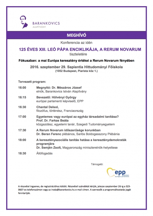 A Rerum novarum, XIII. Leó pápa enciklikája az idén 125 éves. Ebből az alkalomból szeptember 29-én a Barankovics István Alapítvány konferenciát szervez Budapesten, Fókuszban: a mai Európa keresztény értékei a Rerum Novarum fényében címmel. A konferencián több jeles előadó között Semjén Zsolt miniszterelnök-helyettes, a KDNP elnöke és Hölvényi György kereszténydemokrata európai parlamenti képviselő is felszólal.