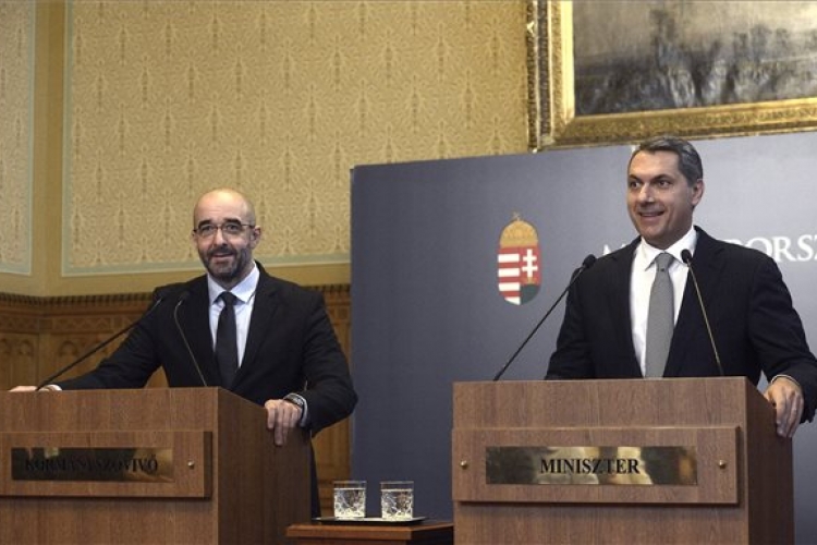 Lázár János, a Miniszterelnökséget vezető miniszter (j) századik szokásos heti sajtótájékoztatóját tartja az Országházban 2017. szeptember 5-én. Mellette Kovács Zoltán kormányszóvivő. MTI Fotó: Soós Lajos