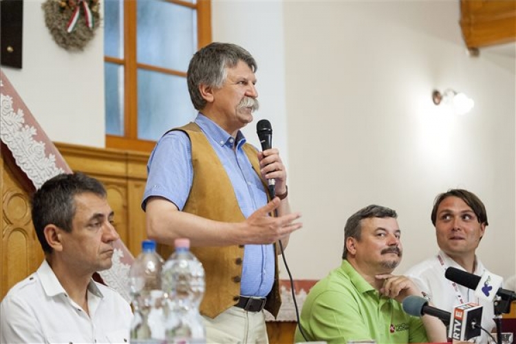 Kövér László, az Országgyűlés elnöke beszél, mellette Potápi Árpád János, a Miniszterelnökség nemzetpolitikáért felelős államtitkára, Berényi József, a szlovákiai Magyar Közösség Pártjának (MKP) elnöke és Gubík László főszervező a III. Martosi Szabadegyetem első napján rendezett fővédnöki fórumon a szlovákiai Martos református templomában 2015. július 8-án. Az erdélyi Tusványos mintájára megalapított ötnapos fórum napirendjén az autonómia és a nemzetpolitika kérdései, valamint a kisebbségi oktatásügy legégetőbb problémái szerepelnek. (MTI Fotó: Krizsán Csaba)