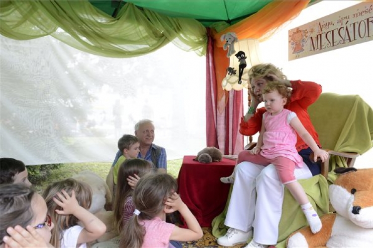 Dunai Mónika fideszes országgyűlési képviselő mesét mond Budapesten, a XVII. kerületi Vigyázó Sándor Művelődési Ház gyermeknapi rendezvényén az Anyu, Apu, mesélj! mesesátorban 2016.május 29-én. (MTI Fotó: Soós Lajos)