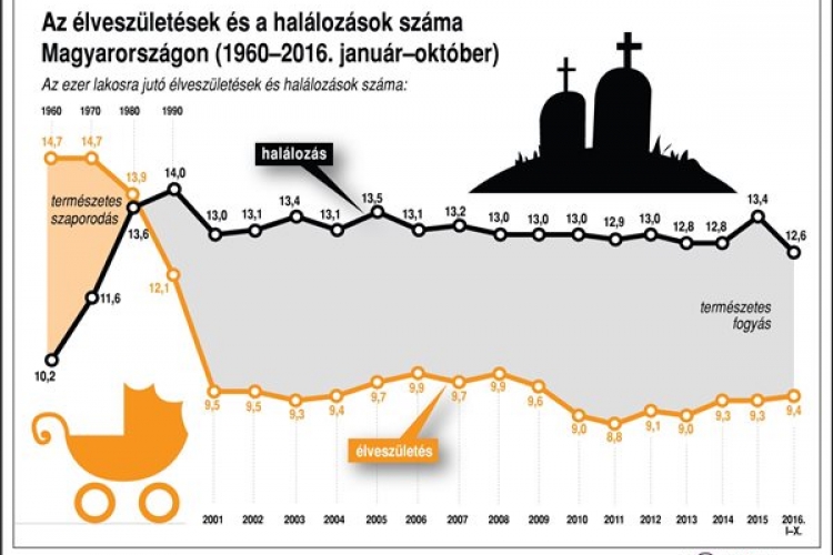 Az élveszületések és halálozások száma Magyarországon, 1960-2016. január-október (MTI)