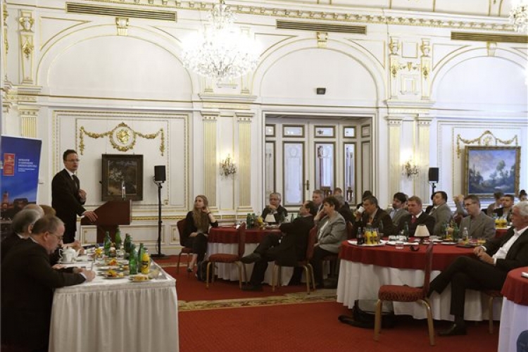 Szijjártó Péter külgazdasági és külügyminiszter előadást tart A világgazdasági fordulatra adott magyar gazdaságpolitikai válasz címmel a Munkaadók és Gyáriparosok Országos Szövetségének (MGYOSZ) csúcstalálkozóján a városligeti Gundel étteremben 2017. május 3-án. (MTI Fotó: Bruzák Noémi)