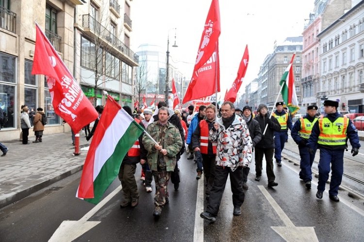 Megérkeztek a Parlamenthez a kormány foglalkoztatáspolitikája ellen tiltakozó „éhségmenetek”; az ország több megyéjéből egy hete útnak indult csoportok hétfőn délután a budapesti Astoriánál egyesültek, majd közösen vonultak az Országház elé; mintegy ezerötszázan voltak, amikor az Alkotmány utcában felállított pódiumhoz értek.