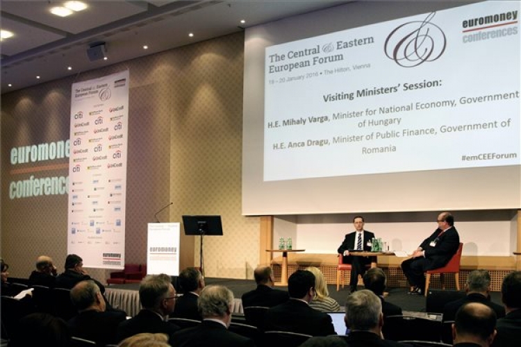 Varga Mihály nemzetgazdasági miniszter és Christopher Garnett, az Euromoney konferencia igazgatója a bécsi Euromoney gazdasági konferencián 2016. január 19-én. (MTI/Fotó: Filep István)