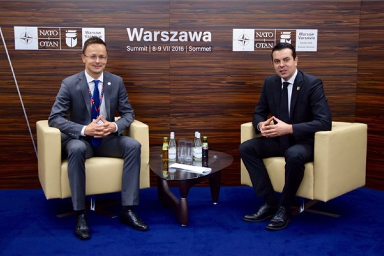 Szijjártó Péter külgazdasági és külügyminiszter és Nikola Poposki macedón külügyminiszter megbeszélést folytat a NATO kétnapos varsói csúcsértekezletének első napján, 2016. július 8-án a Nemzeti Stadionban. (MTI Fotó: KKM)