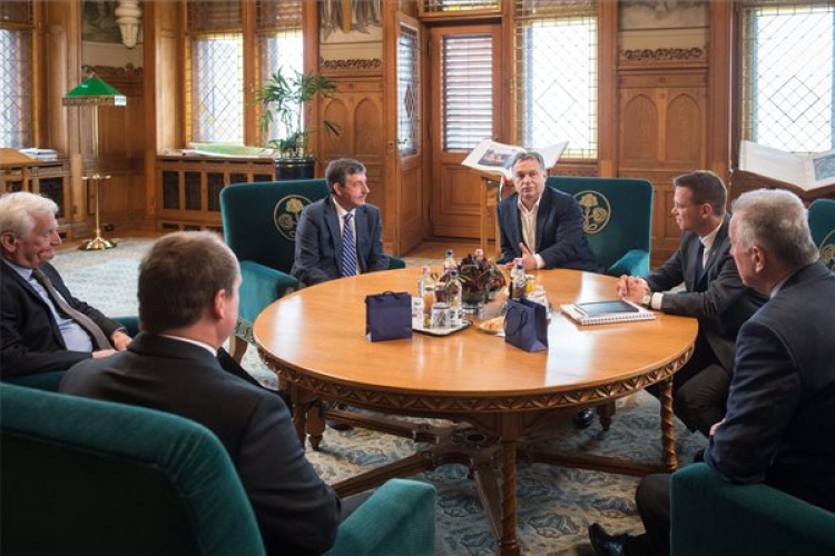 A Miniszterelnöki Sajtóiroda által közreadott képen Orbán Viktor miniszterelnök fogadja hivatalában a Nemzetközi Kajak-Kenu Szövetség vezetőit, José Perurena elnököt (b3) és Simon Toulson főtitkárt (b2, háttal), valamint Baráth Etelét, a magyar sportági szakszövetség elnökét (b) 2016. május 11-én. Jobbról Schmitt Pál volt köztársasági elnök, a Magyar Olimpiai Bizottság tiszteletbeli elnöke (j) és Fürjes Balázs, a kiemelt budapesti beruházások kormánybiztosa, a budapesti olimpiai pályázat vezetője (j2). (MTI Fotó: Miniszterelnöki Sajtóiroda/botár Gergely)