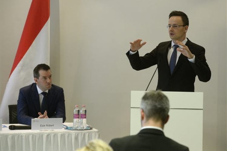 Szijjártó Péter külgazdasági és külügyminiszter beszédet mond a Nemzeti Befektetési Ügynökség (HIPA) 2015. évi eredményeiről, a szervezet tevékenységének, portfóliójának és további terveinek bemutatásáról tartott sajtótájékoztatón a HIPA budapesti székházában 2016. február 11-én. Balra Ésik Róbert, a HIPA elnöke. (MTI Fotó: Bruzák Noémi)