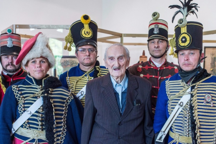 A 102 éves Hegedűs Ferenc, a legidősebb huszár, doni veterán - akit huszárként soroztak, majd páncélosként szolgált a II. világháborúban -, hagyományőrzőkkel fényképezkedik a Máday Norbert műgyűjtő gyűjteményéből rendezett. A magyar huszár című kiállítás megnyitóján a kecskeméti Cifrapalotában 2016. május 5-én (MTI/Ujvári Sándor)