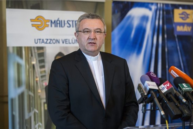 Veres András szombathelyi megyés püspök, a Magyar Katolikus Püspöki Konferencia elnöke a MÁV-START Zrt. és a Misszió Tours Utazási Iroda közös, az idei nyári zarándokvonatokról tartott sajtótájékoztatóján a Nyugati pályaudvar Királyi várótermében 2016. február 4-én. (MTI Fotó: Illyés Tibor)