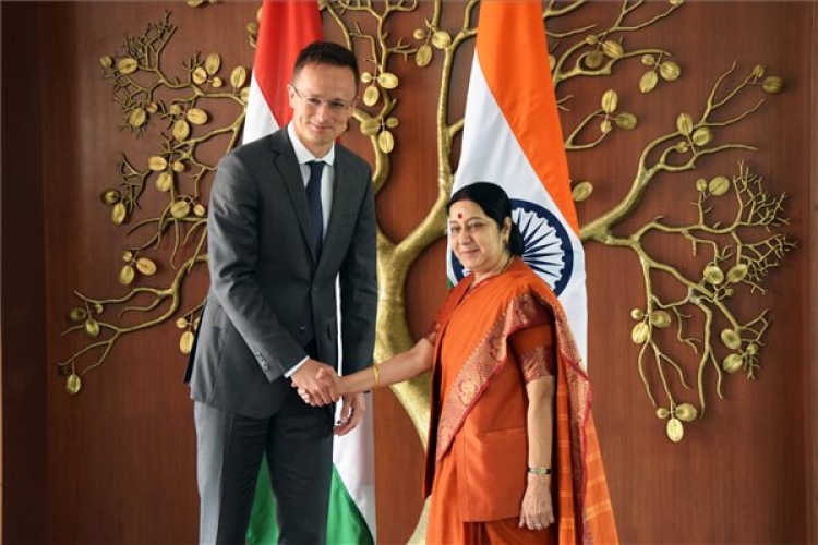 Szijjártó Péter külgazdasági és külügyminiszter és Szusma Szvarádzs indiai külügyminiszter találkozója Újdelhiben 2016. július 5-én. (MTI Fotó: KKM)