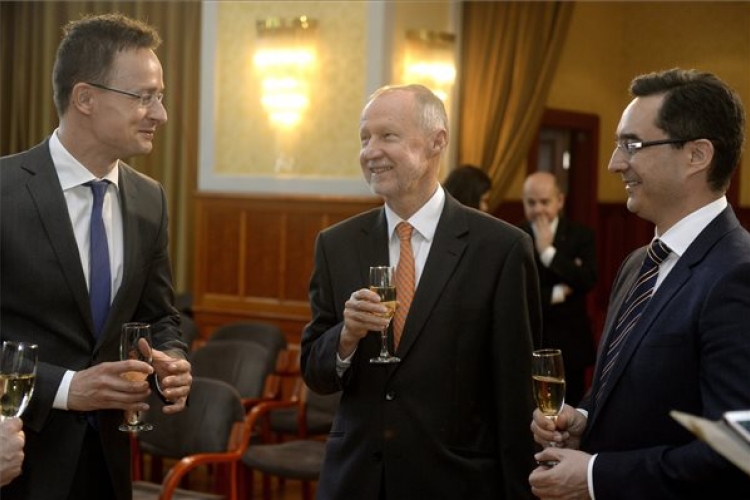 Szijjártó Péter külgazdasági és külügyminiszter, Bogsch Erik, a Richter Gedeon Nyrt. vezérigazgatója (k) és Papp László, Debrecen polgármestere (j) a Richter Gedeon Nyrt. beruházásbejelentő sajtótájékoztatója után Budapesten, a Külgazdasági és Külügyminisztériumban 2016. március 8-án.
