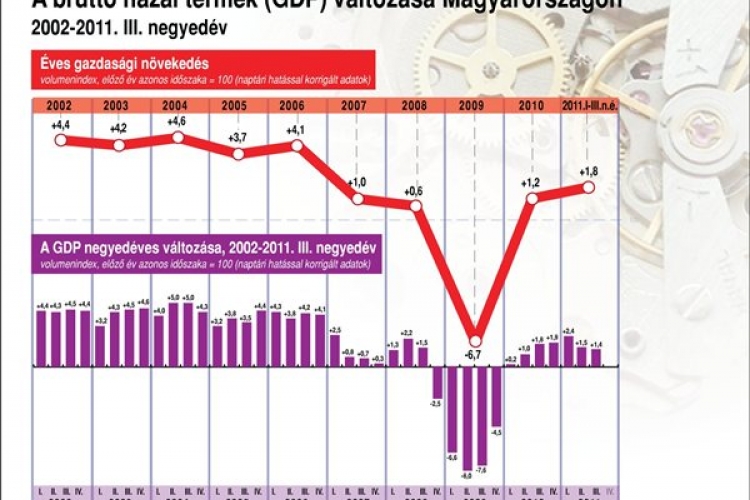 Magyarország bruttó hazai terméke (GDP) 1,4 százalékkal nőtt 2011 harmadik negyedévében az előző év azonos időszakához képest, a szezonálisan és naptárhatással kiigazított adatok szerint az előző negyedévhez viszonyítva 0,5 százalék volt a növekedés - közölte a Központi Statisztikai Hivatal (KSH) az előzetes számok alapján. Londoni elemzők a harmadik negyedévre, 0,7-1,2 százalék körüli gazdasági növekedést vártak éves bázison.