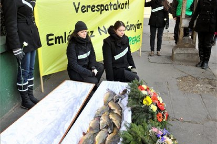 A tiltakozás része a környező országok fővárosaiban rendezett hasonló megmozdulásoknak - mondta Vetier Márta a Greenpeace programigazgatója a nagykövetség bejárata elé kitett koporsó mellett, amit a nagybányai halpusztulásra emlékezve hallal töltöttek meg.