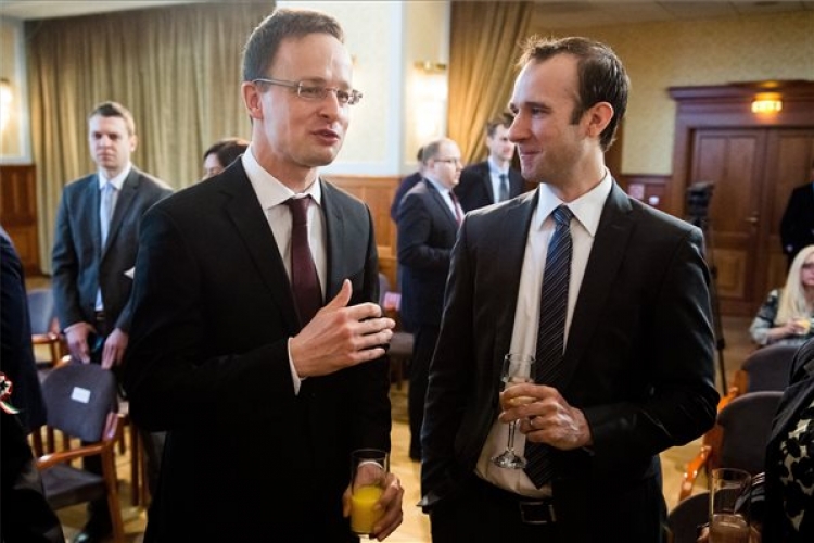 Szijjártó Péter külgazdasági és külügyminiszter és Christopher Hunley, a GSK Biologicals Kft., a GSK gödöllői gyárának igazgatója a GlaxoSmithKline (GSK) beruházásáról tartott sajtótájékoztató után a Külgazdasági és Külügyminisztériumban 2017. március 13-án. (MTI Fotó: Balogh Zoltán)