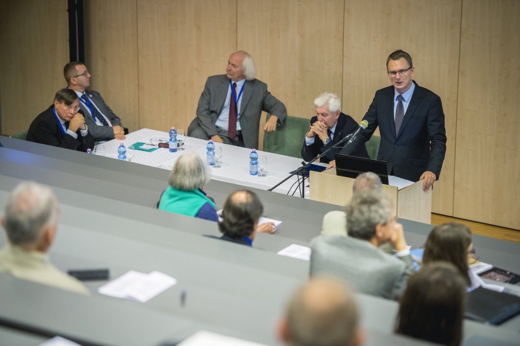 Rétvári Bence, az Emberi Erőforrások Minisztériuma kereszténydemokrata parlamenti államtitkára beszédet mond a Zrínyi-emlékév keretében kezdődött négynapos nemzetközi történész konferencián a pécsi Tudásközpontban 2016. szeptember 6-án. Mellette Bódis József, a Pécsi Tudományegyetem (PTE) rektora (j2), Fodor Pál, a Magyar Tudományos Akadémia (MTA) Bölcsészettudományi Kutatóközpontja Történettudományi Intézetének főigazgatója (b3), Pap Norbert, a Pécsi Tudományegyetem Kelet-Mediterrán és Balkán Tanulmányok Központjának igazgatója (b2) és Hóvári János, a Zrínyi Miklós - Szigetvár 1566 Emlékév Emlékbizottság elnöke (b). (MTI Fotó: Sóki Tamás)