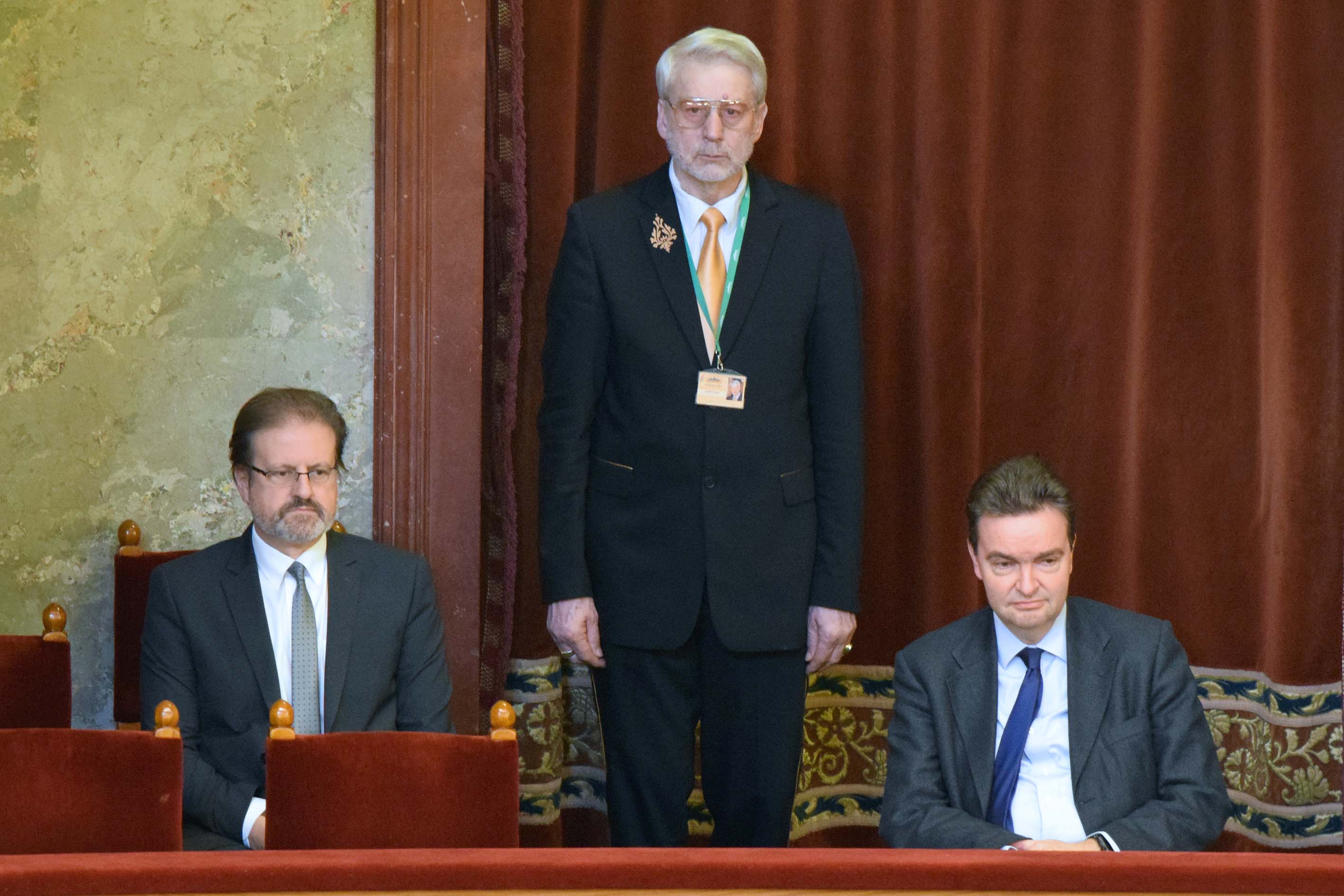 Semjén Zsolt miniszterelnök-helyettes beszédét az Országház díszpáholyában a család képviseltében Habsburg György, az uralkodó unokája kísérte figyelemmel (j) Jenik Péter, a miniszterelnök-helyettes kabinetfőnökének társaságában (b). (KDNP Fotó: Váli Miklós)