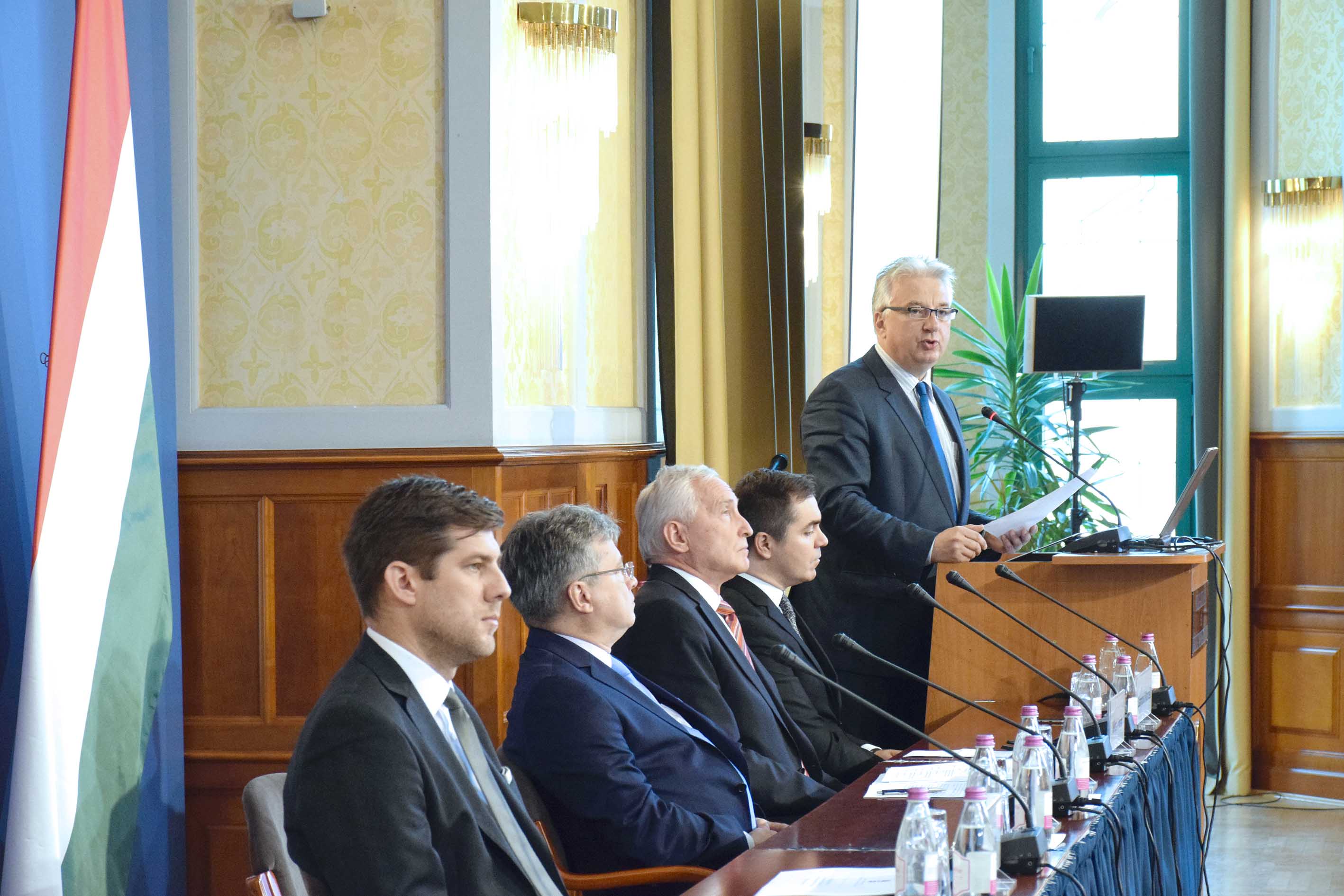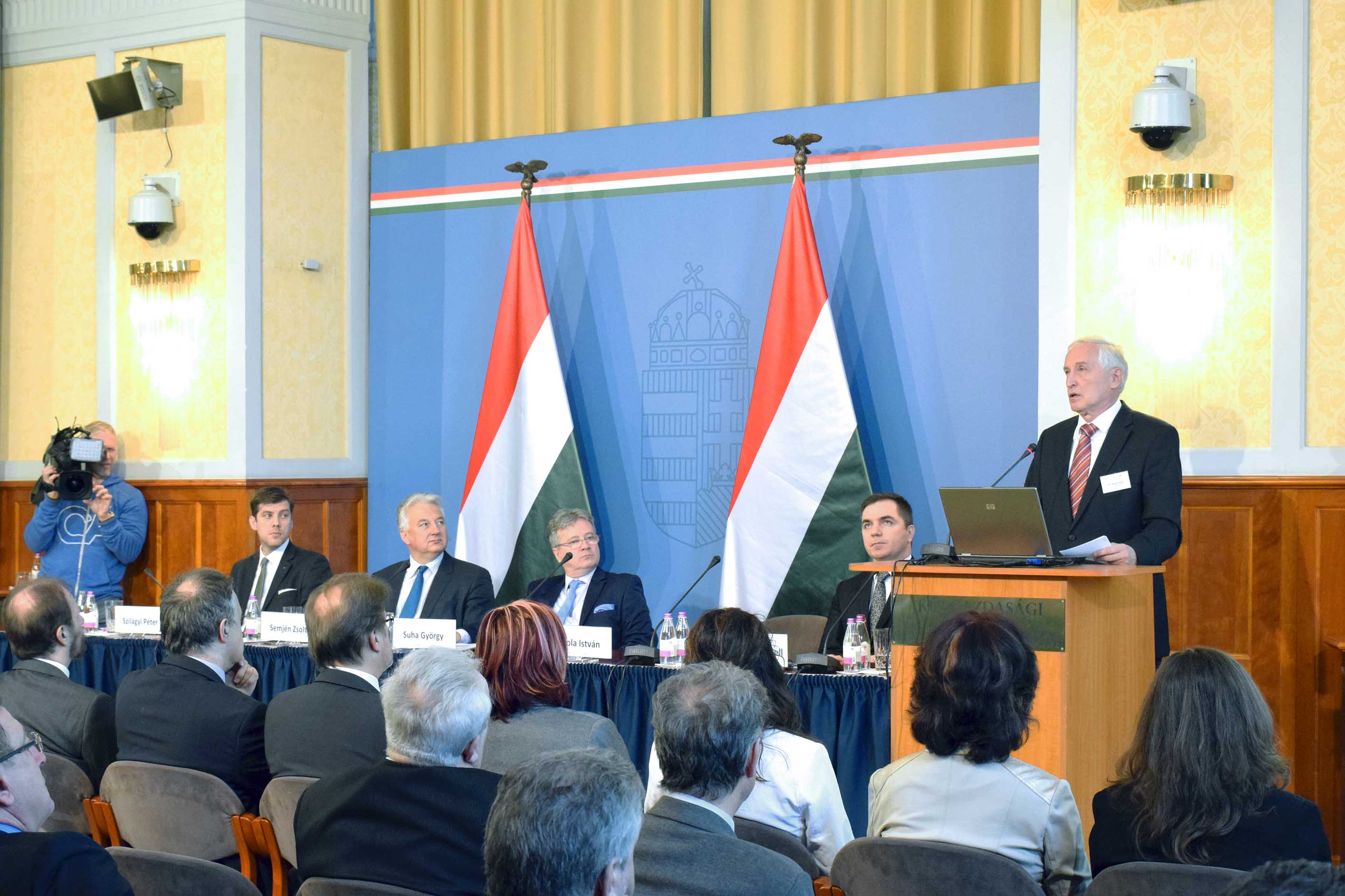 Mikola István, a külügyi tárca biztonságpolitikai és nemzetközi együttműködésért felelős államtitkára mond beszédet a Magyarországon akkreditált konzuli misszióvezetők számára rendezett szakmai fórumon a Külgazdasági és Külügyminisztériumban 2016. november 21-én.(Fotó: Váli Miklós)