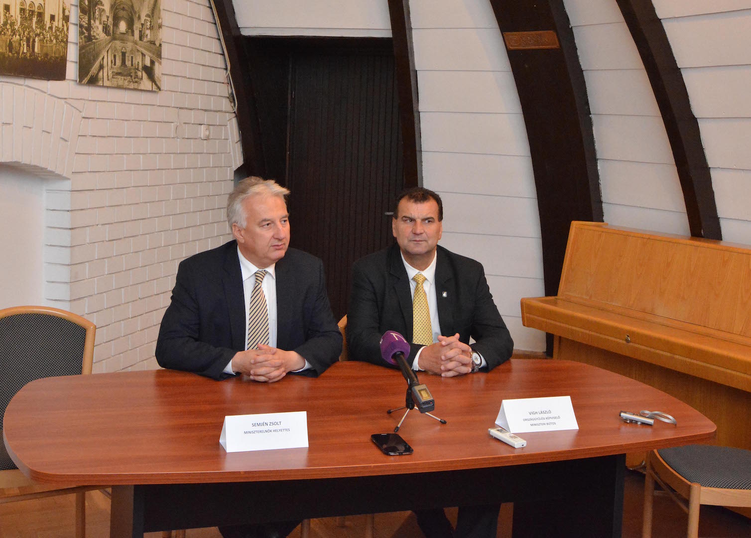 Semjén Zsolt miniszterelnök-helyettes, Kereszténydemokrata Néppárt elnöke és Vigh László, Zalaegerszeg térségének fideszes országgyűlési képviselője a nemzeti konzultációról tartott lakossági fórum előtti sajtótájékoztatón, Zalaegerszegen, 2017. október 24-én. (Fotó: Váli Miklós)