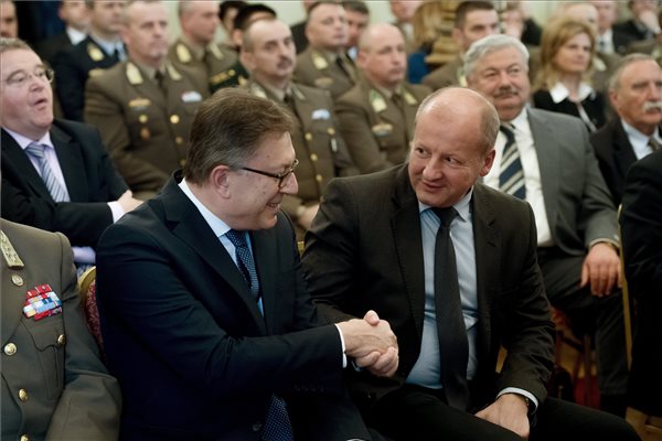 Tacan Ildem, a NATO közkapcsolatokért felelős helyettes-főtitkára és Simicskó István kereszténydemokrata honvédelmi miniszter a Magyar Atlanti Tanács 25. évfordulója alkalmából rendezett jubileumi ünnepségen a Magyar Tudományos Akadémián 2017. március 9-én. Mögöttük jobbra Lomnici Zoltán, az Emberi Méltóság Tanácsának (EMT) elnöke. (MTI Fotó: Koszticsák Szilárd)
