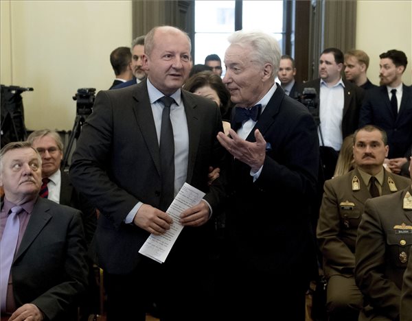 Simicskó István honvédelmi miniszter és Vizi E. Szilveszter akadémikus, a Magyar Atlanti Tanács (MAT) elnöke a MAT 25. évfordulója alkalmából rendezett jubileumi ünnepségen a Magyar Tudományos Akadémián 2017. március 9-én. (MTI Fotó: Koszticsák Szilárd)