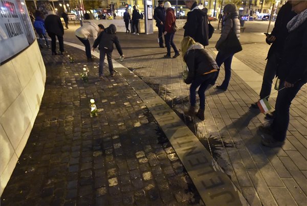 Résztvevők vízzel locsolják le a Móricz Zsigmond téri Gomba körüli új '56-os emlékművet az alkotás átadásán az 1956-os forradalom és szabadságharc 60. évfordulóján, 2016. október 23-án. Az alkotáson Örkény István író Fohász Budapestért című művének részlete olvasható, ha víz éri. (MTI Fotó: Máthé Zoltán)