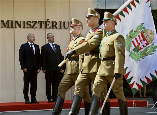 Simicskó István honvédelmi miniszter katonai tiszteletadás mellett fogadja Peter Gajdos szlovák védelmi minisztert a Honvédelmi Minisztérium előtt 2017. május 4-én. (MTI Fotó: Bruzák Noémi)