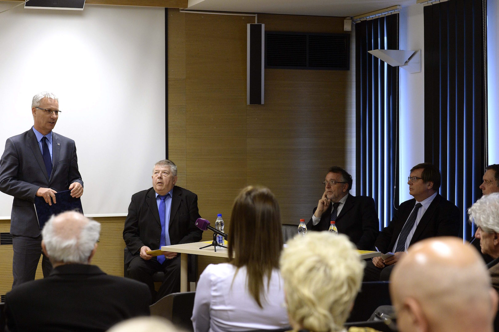 Soltész Miklós az egyházi, nemzetiségi és civil társadalmi kapcsolatokért felelős államtitkár beszédet mond a Keresztény-Zsidó Társaság (KZST) megalakulásának 25. és Eötvös Károly, a tiszaeszlári perben rituális gyilkossággal megvádolt zsidó emberek védőügyvédje halálának 100. évfordulója alkalmából tartott megemlékezésen a Holokauszt Emlékközpontban 2016. május 12-én. Mellette Szita Szabolcs, az emlékközpont vezetője (b2), Heisler András, a Magyarországi Zsidó Hitközségek Szövetségének (Mazsihisz) elnöke (j3), Fabinyi Tamás evangélikus püspök (j2) és Szécsi József, a Keresztény-Zsidó Társaság főtitkára (j). (MTI Fotó: Bruzák Noémi)