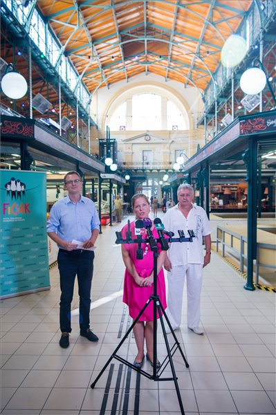 Király Nóra, a Fiatal Családosok Klubjának alapítója (k), Rétvári Bence, az Emberi Erőforrások Minisztériumának (Emmi) parlamenti államtitkára (b) és Schvets Zsolt több iskolai büfé üzemeltetője a Hold utcai vásárcsarnokban tartott sajtótájékoztatón 2017. augusztus 10-én. (MTI Fotó: Balogh Zoltán)