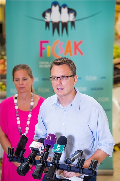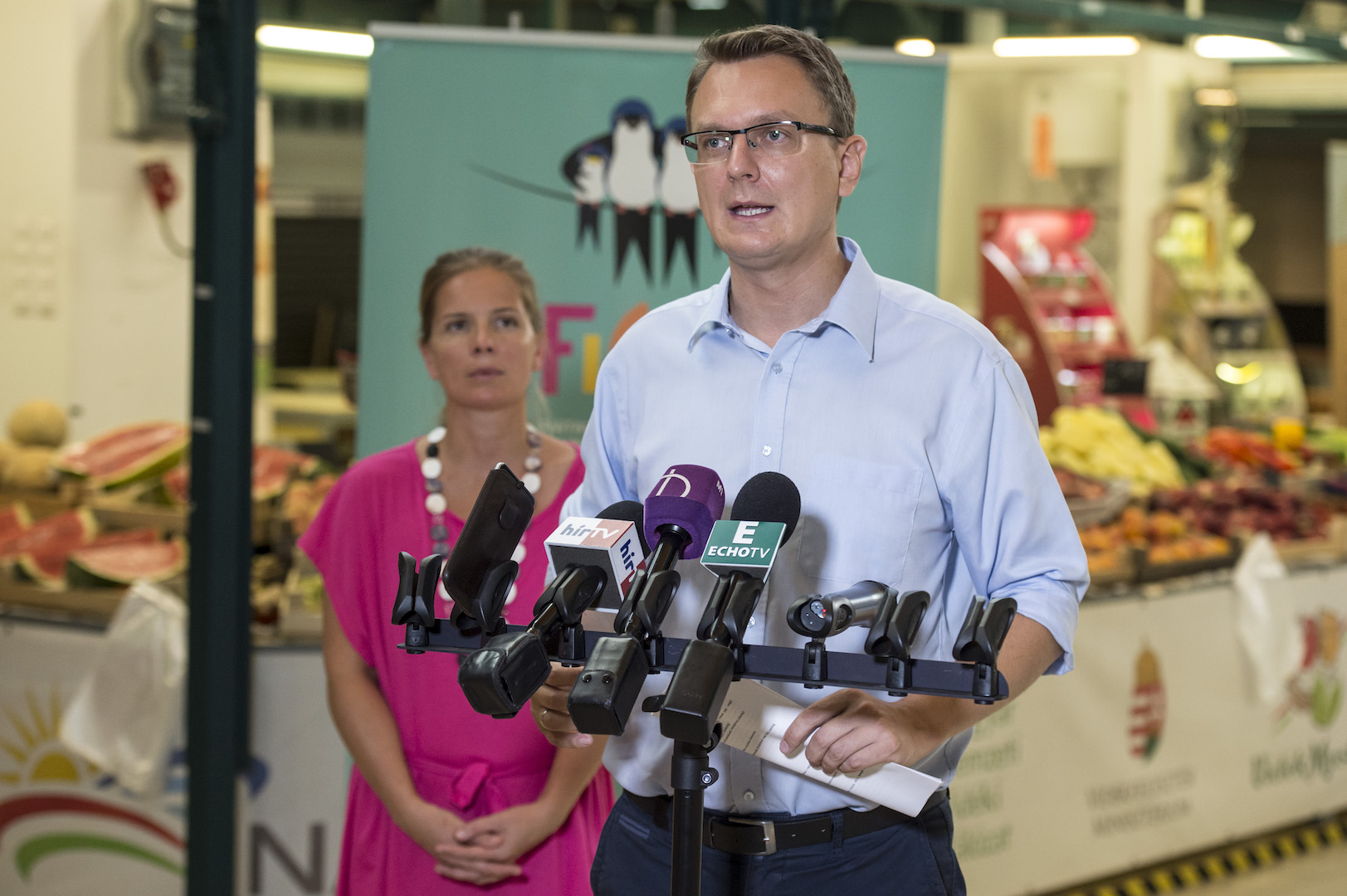 Rétvári Bence, az Emberi Erőforrások Minisztériumának (Emmi) parlamenti államtitkára és Király Nóra, a Fiatal Családosok Klubjának alapítója (b) a Hold utcai vásárcsarnokban tartott sajtótájékoztatón 2017. augusztus 10-én. (MTI Fotó: Balogh Zoltán)