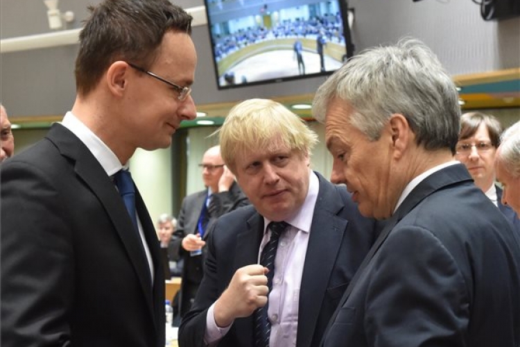 A Külgazdasági és Külügyminisztérium (KKM) által közreadott képen Szijjártó Péter külgazdasági és külügyminiszter, Didier Reynders belga és Boris Johnson brit külügyminiszter (b-j) beszélget az Európai Unió külügy- és védelmi miniszterei együttes ülése és a Külügyek Tanácsa brüsszeli munkaülése idején 2017. március 6-án. (Fotó: KKM / Szabó Árpád – MTI)