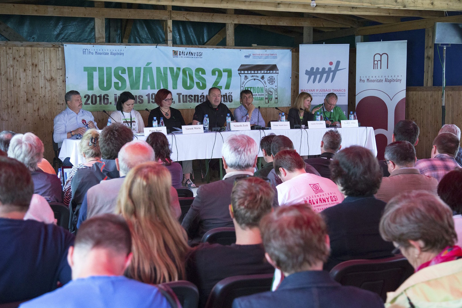 Albert Tibor, Tusnádfürdő polgármestere, Popa Ilona erdélyi főszervező, Tárnok Mária, a Kisebbségekért – Pro Minoritate Alapítvány kuratóriumának elnöke, Németh Zsolt, az Országgyűlés külügyi bizottságának elnöke, Potápi Árpád János nemzetpolitikáért felelős államtitkár, Sándor Krisztina, az Erdélyi Magyar Nemzeti Tanács ügyvezető elnöke és Toró T. Tibor, az Erdélyi Magyar Néppárt alelnöke (b-j) a 27. Bálványosi Nyári Szabadegyetem és Diáktábor (Tusványos) megnyitóján az erdélyi Tusnádfürdőn 2016. július 20-án. (MTI Fotó: Baranyi Ildikó)