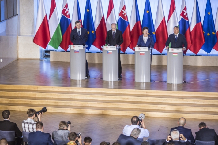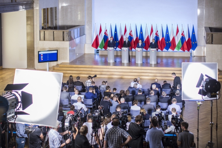 Robert Fico szlovák, Bohuslav Sobotka cseh, Beata Szydlo lengyel és Orbán Viktor magyar miniszterelnök (b-j) sajtótájékoztatót tart a visegrádi országok miniszterelnökeinek varsói találkozóján 2016. július 21-én. (MTI Fotó: Miniszterelnöki Sajtóiroda/Szecsődi Balázs)