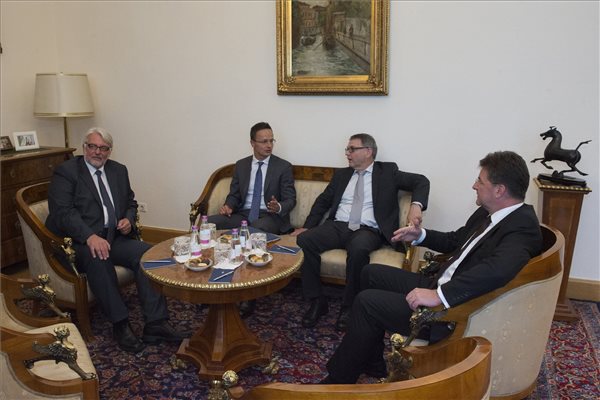 A Külgazdasági és Külügyminisztérium (KKM) által közreadott képen Witold Waszczykowski lengyel külügyminiszter, Szijjártó Péter külgazdasági és külügyminiszter, Lubomír Zaorálek cseh és Miroslav Lajcák szlovák külügyminiszter (b-j) a KKM budapesti misszióvezetői értekezletén 2016. augusztus 29-én. (MTI Fotó: KKM / Kovács Márton)